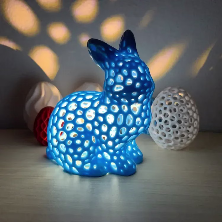 Modell eines Hasen mit organisch anmutender Lochstruktur für faszinierende Lichtspiele. Ideal geeignet als stimmungsvolle Osterdekoration oder ganzjähriger Hingucker mit LED- oder Teelichtbeleuchtung. Der perforierte Körper erzeugt ein warmes, dekoratives Muster an der Wand und sorgt für gemütliches Ambiente.